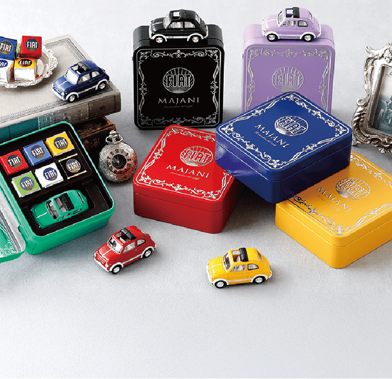 イタリアで200年以上に渡りボローニャの宝石とまで称されたMajaniチョコレート。1911年にFiatの依頼により作り出された各味の違うMajani Fiatチョコレート6粒(クラシコ、ノワール、エクストラノワール、ピスタチオ、フリーダム、カラメル)と可愛いFiat500プルバックミニカーがセットになった商品、Majaniチョコレートミニカーセット。