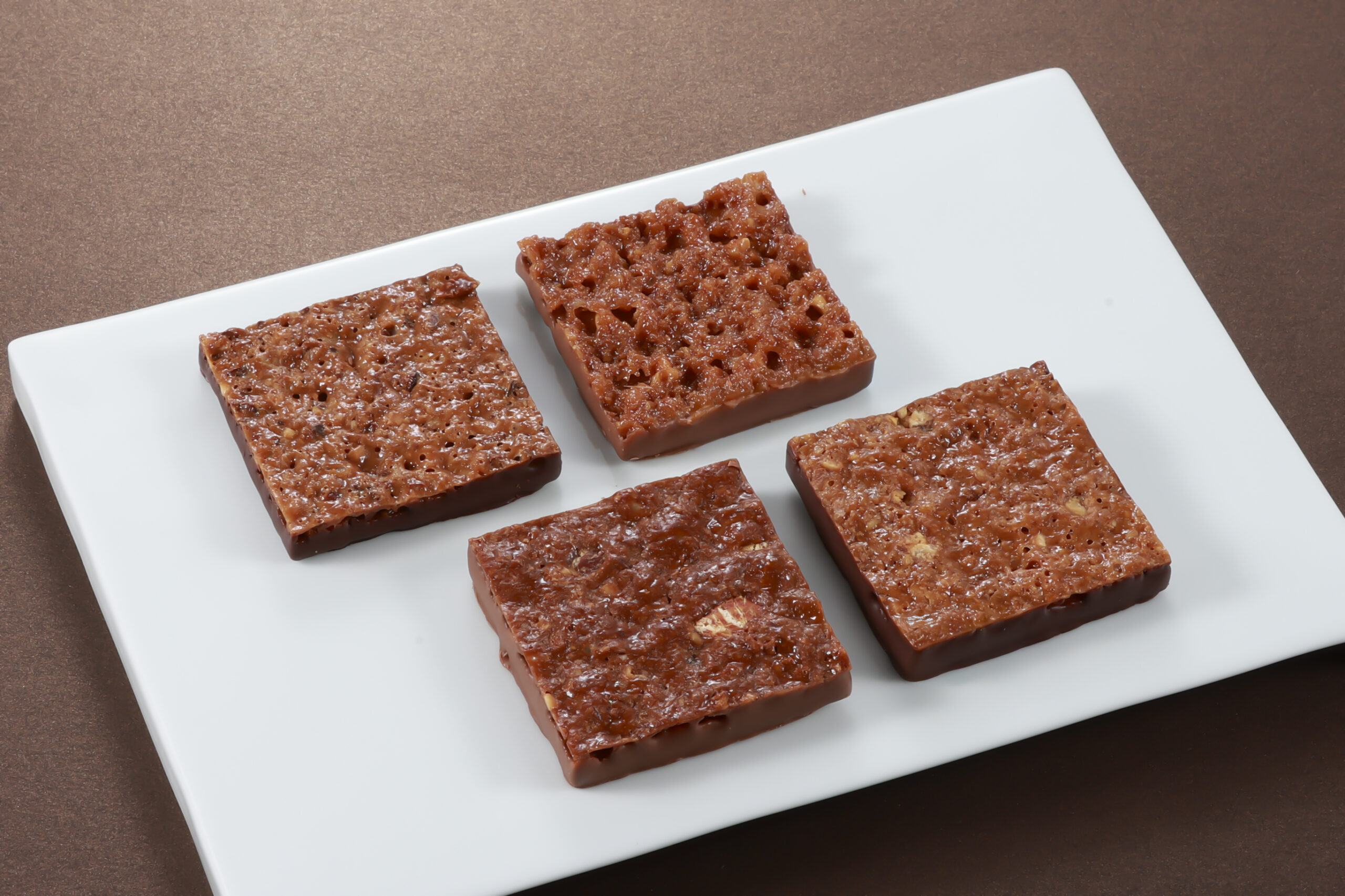 ヌガティーヌを合せたサブレをチョコレートでコーティング。