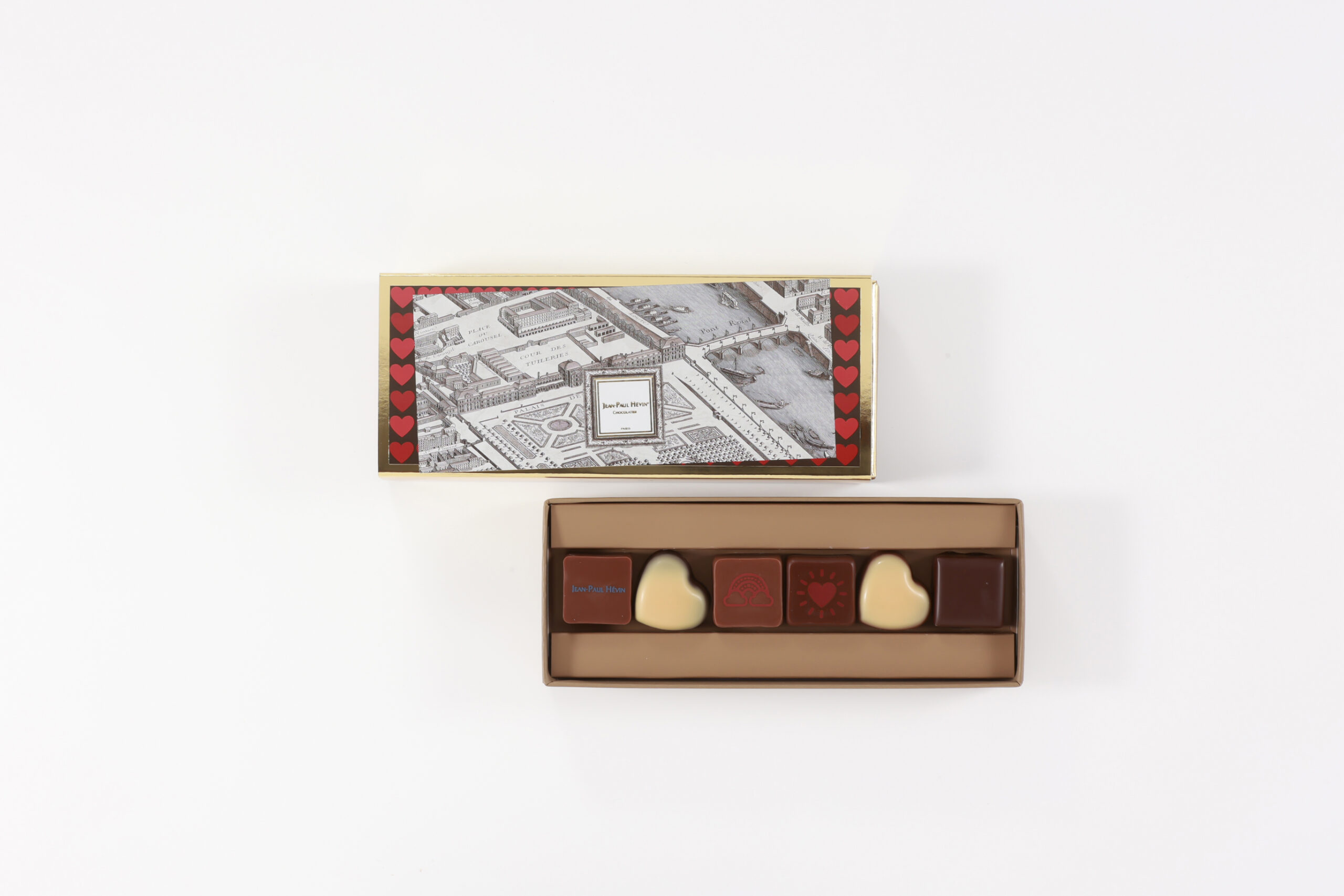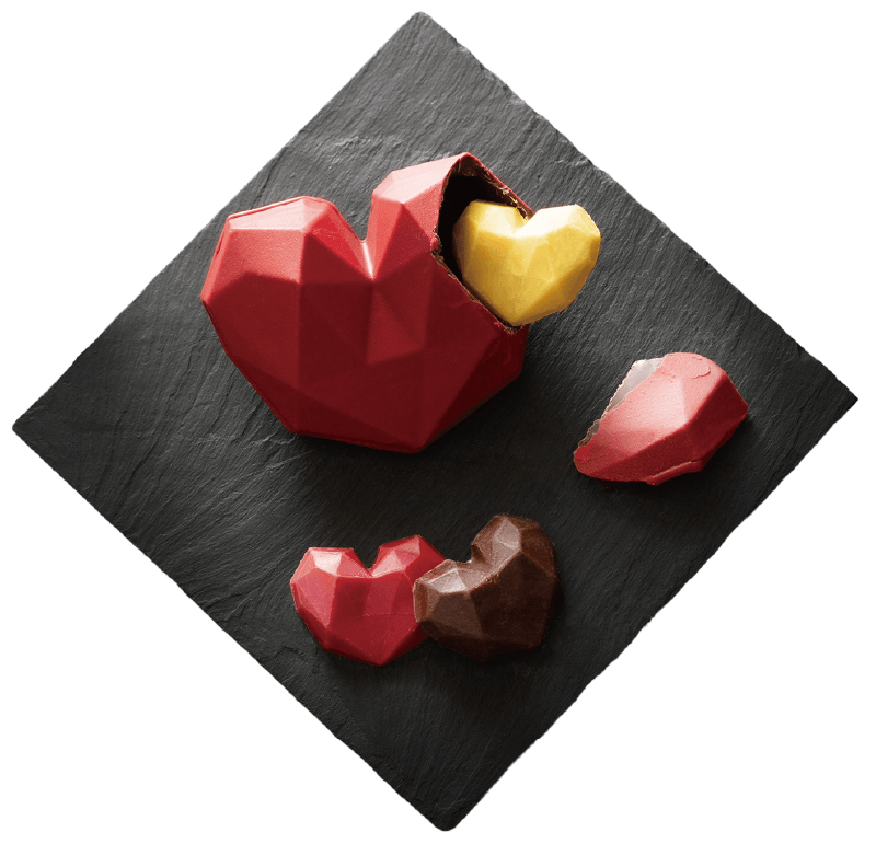 ミルクチョコレートでかたどった手のひらサイズのハートの中に、心ときめく3つのハートを詰め込みました。