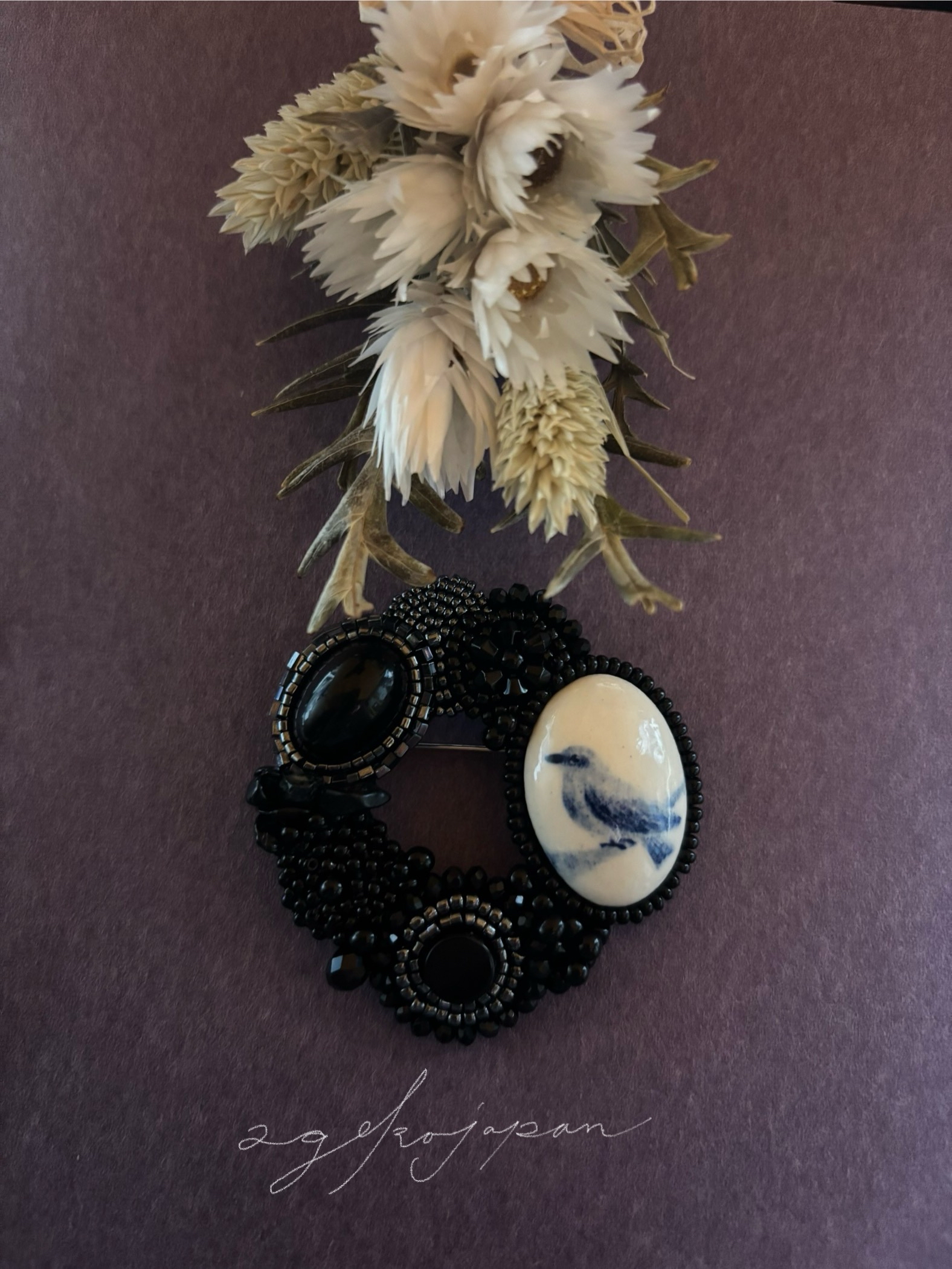 陶器に絵付けをした陶カボションを宝石に見立て、ビーズ刺繍で装身具に仕立てました。
